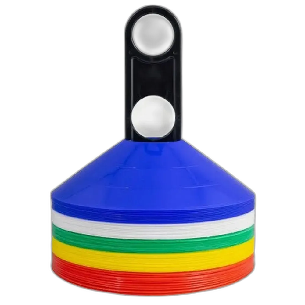 Markeringstallerkener i forskjellige farger. Beholder for stabling og til transport av markeringstallerkene følger med. Markeringstallerknene har sterke og klare farger, og er laget i myk plast.