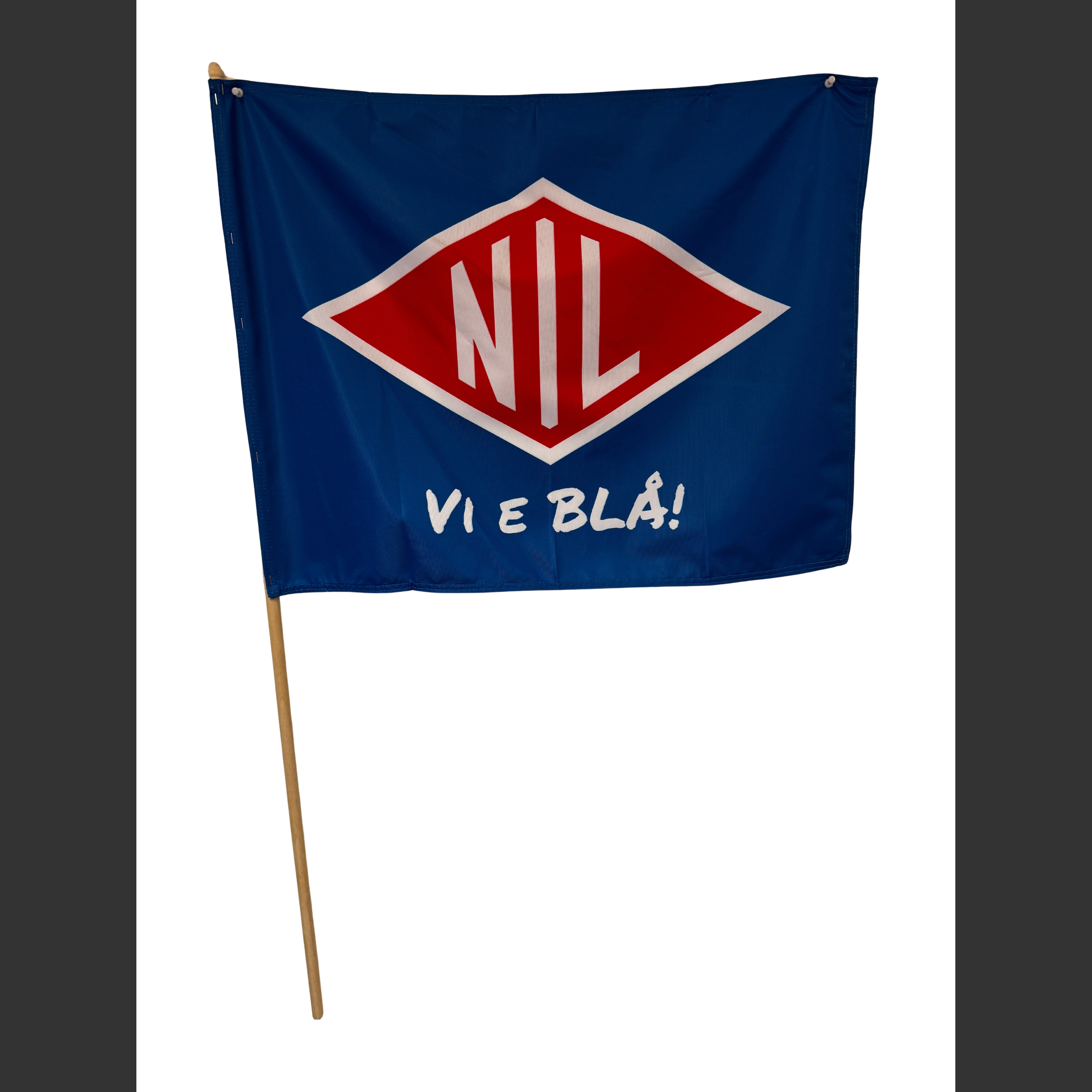 Heis flagget og vis hvem du heier på! NIL-flagget kommer i klassisk blå med den ikoniske NIL-logoen og teksten «VI E BLÅ!» trykket i hvitt. Perfekt til kampdager, arrangementer og støtte fra tribunen. Leveres med trepinne for enkel bruk og solid kvalitet som tåler utendørs bruk.