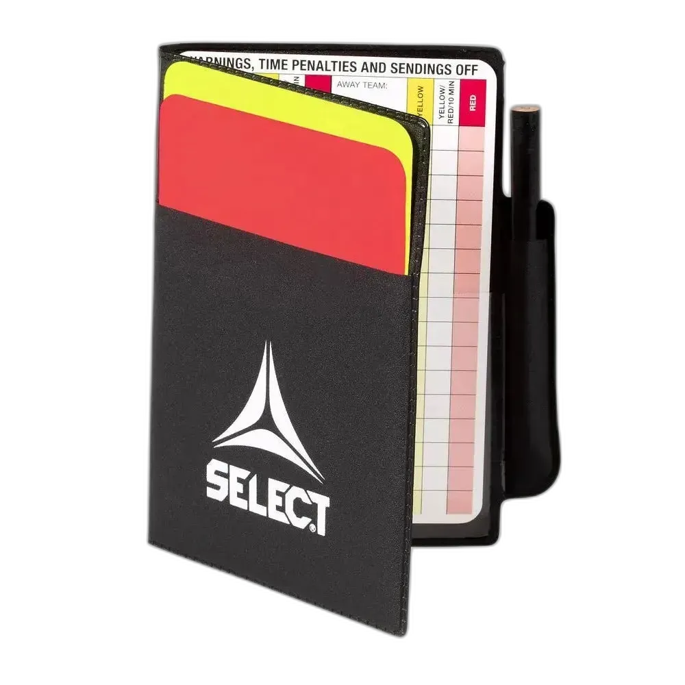 Dommersett fra Select. Liten og praktisk dommermappe til fotballkamper. Komplett sett med notatblokk, kort, blyant og mynt.